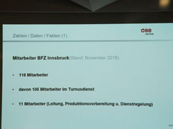 Anschließend präsentierte Projektkoordinator Pühringer Werner die geplanten Infrastrukturprojekte bis zum Jahr 2030 im Bereich der Region West. Auslöser dazu sind die gestiegenen Anforderungen an die Infrastruktur, den Abhängigkeiten von Projekten zum Brenner Basistunnel, die Erneuerung der Sicherungsanlagen und -einrichtungen sowie die Erfüllung von Kundenanforderungen. Von den vorgestellten vielen wichtigen Einzelprojekten soll hier der Neubau der BFZ Innsbruck bis 2028 genannt werden. Das Unternehmen will anstelle der derzeitigen Mietvariante - auch aus Sicherheitsgründen wegen der "Kritischen Infrastruktur" - in einen neu zu errichtenden eigenen Hochbau übersiedeln.